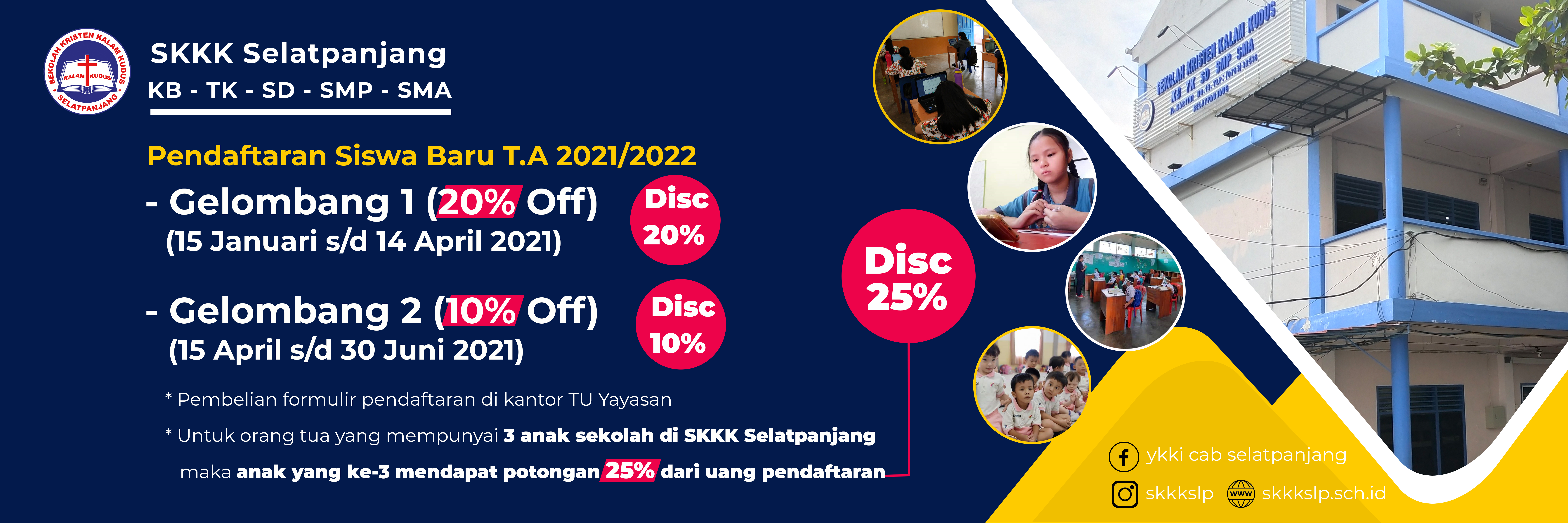 Telah dibuka pendaftaran siswa baru T.A 2021/2022, Gelombang 1 dimulai dari 15 Januari - 14 April 2021 dan dapatkan diskon 20% uang pendaftaran. Gelombang 2 dimulai dari 15 April - 30 Juni 2021 dan dapatkan diskon 10% uang pendaftaran. Kabar baik bagi orang tua yang 3 anaknya sekolah di SKKK Selatpanjang, akan mendapatkan potongan 25% uang pendaftaran untuk anak ke 3 nya.