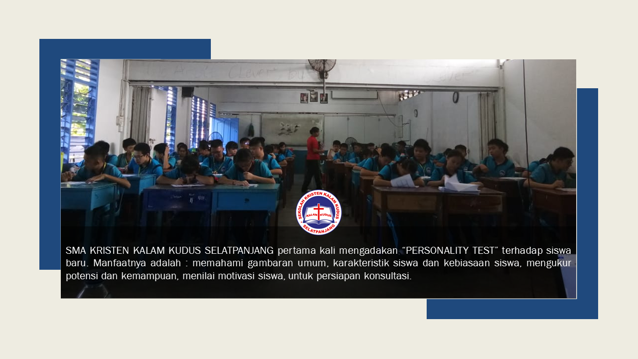 Pada kegiatan PLS (Pengenalan Lingkungan Sekolah) tahun ini, SMA Kristen Kalam Kudus Selatpanjang mengadakan tes kepribadian atau personality test terhadap peserta didik baru. Sekolah Kristen Kalam Kudus Selatpanjang telah mempersiapkan ahli dibidang psikologi pada tahun ini dengan harapan dengan adanya ahli psikolog,