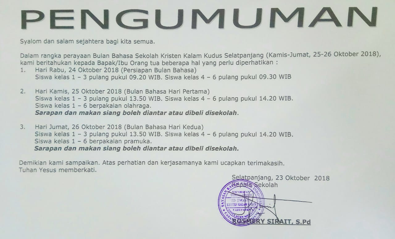 Dalam rangka perayaan Bulan Bahasa Sekolah Kristen Kalam Kudus Selatpanjang ( Kamis - Jumat, 25 - 26 Oktober 2018 ), kami beritahukan kepada bapak/ibu beberapa hal yang perlu diperhatikan :
